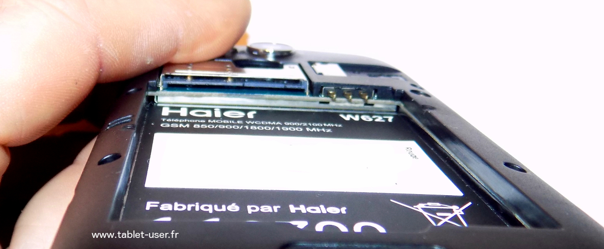On voit les deux emplacement de cartes SIM ( superposés ) et l’emplacement de la carte SD qui peut être changée sans retirer la batterie …