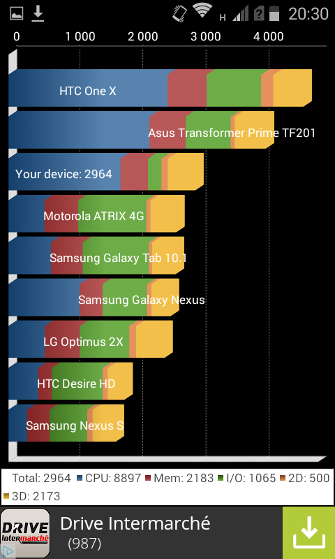 Le Kazam Trooper X45 fait 3597 le Logicom S450 3416 et l’Infinix Race Max Q 4834 , l’ Acer Liquid E3 4858 , le Lazer Grand 6 fait 8647 , le Moto E fait 5132 et le Wiko birdy fait 5504 . le Galaxy Core Prime fait 12349 … On a là avec ses 2964 un score très décevant !