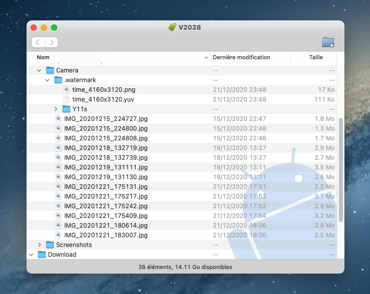 De fait il semble que la machine utilise un dossier spécifique à Vivo dont le nom commence par un point , on ne peut donc copier le dossier des images en intégralité via Android File Transfert ( sur Mac ) …