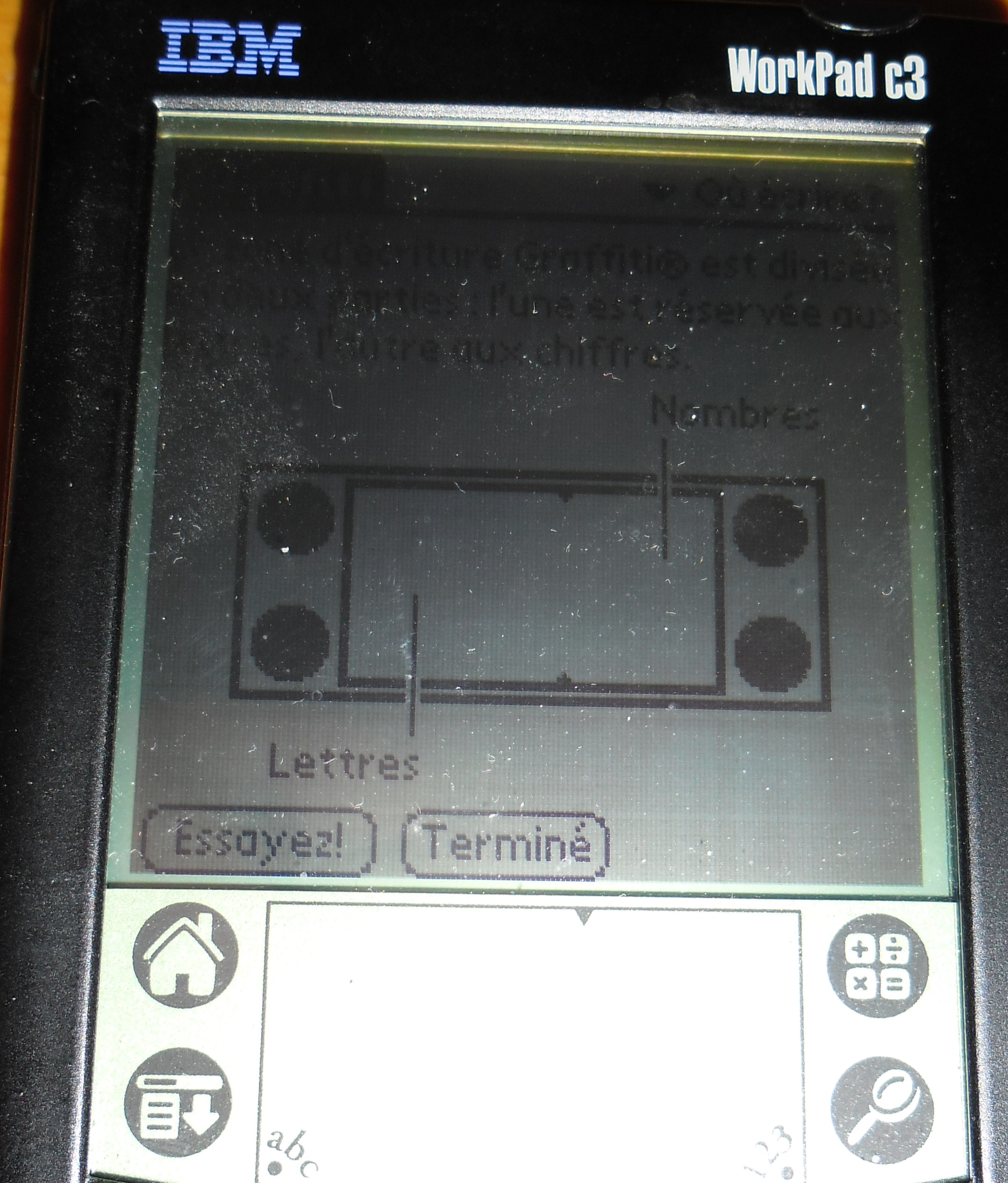 Quelques captures d'écran … Alors tout d'abord le tutoriel de reconnaissance d'écriture … Cela n'était pas une reconnaissance d'écriture normale mais simplifiée ( pour le Palm ) qui faisait correspondre un signe symbolisant une lettre … Grosso modo il fallait apprendre un nouvel alphabet …