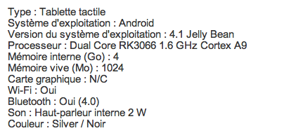 Ce serait une tablette avec un processeur RK3066 , 2 Giga de RAM et 8 de stockage interne , HDMI et une batterie de 8000 MaH . L'écran ne serait pas HD sinon ce serait précisé sur le dos de l'appareil , cependant comme elle remplace des tablettes avec écran IPS je n'imagine pas qu'elle n'en aie pas .