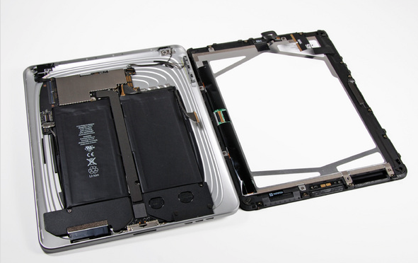 La première raison est que pour des raisons d’autonomie une tablette en 2010 est une grosse batterie prenant presque toute la place de la tablette accolée à un écran , le tout commandé par une petite carte mère ... Il suffit de voir l'intérieur d’ un iPad ( photo ci dessous ) Pour réussir une tablette avec une grande partie transparente ce serait condamner la tablette à une autonomie de quelques minutes . Autant dire qu’avec les techniques actuelles une telle tablette avec une autonomie correcte ne peut exister .
