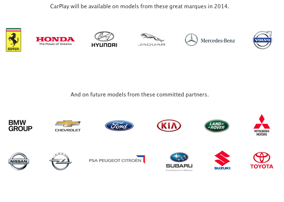 Apple a annoncé CarPlay , un système automobile IOS se comportant comme une extention des iPhones , nombre de fabricants auront des voitures intégrant ce système : Volvo , Ferrari, Mercedes-Benz sont déjprêts . Apple déclare que BMW , Ford , General Motors , Honda , Hyundai , Jaguar , Land Rover , Nissan , Peugeot , Citroën ( et donc certainement DS puisque dans certains pays cela devient une marque ) , Subaru , Suzuki , Kia , Mitsubishi , Toyota vont suivre …
