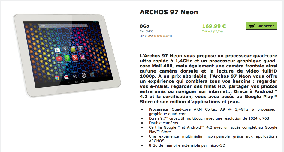 rchos vends sur son site l’ Archos 97 Neon à 169 Euros et l’ Archos 101 Neon à 149 Euros …